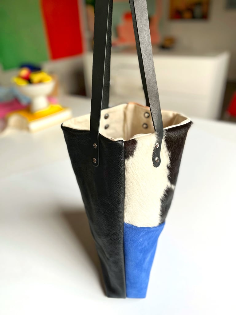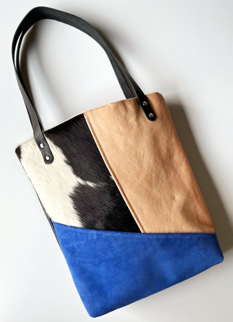 Almost a decade of bag making has left me with a rich supply of leather scraps too small to use in standard production and far too beautiful to part with - or worse yet, throw away. Each bag in the collage series is individually hand cut and sewn, resulting in truly one of a kind combinations of color and texture. This blue edition is an assemblage of veg tan, hair on hide, suede, and motorcycle leather.