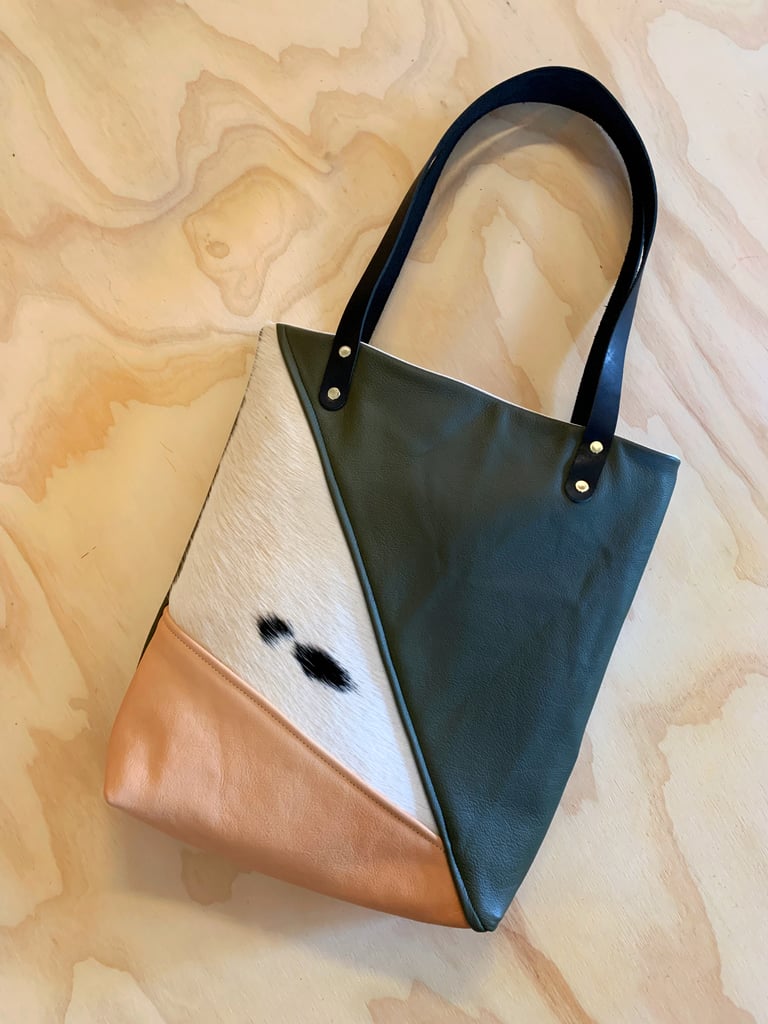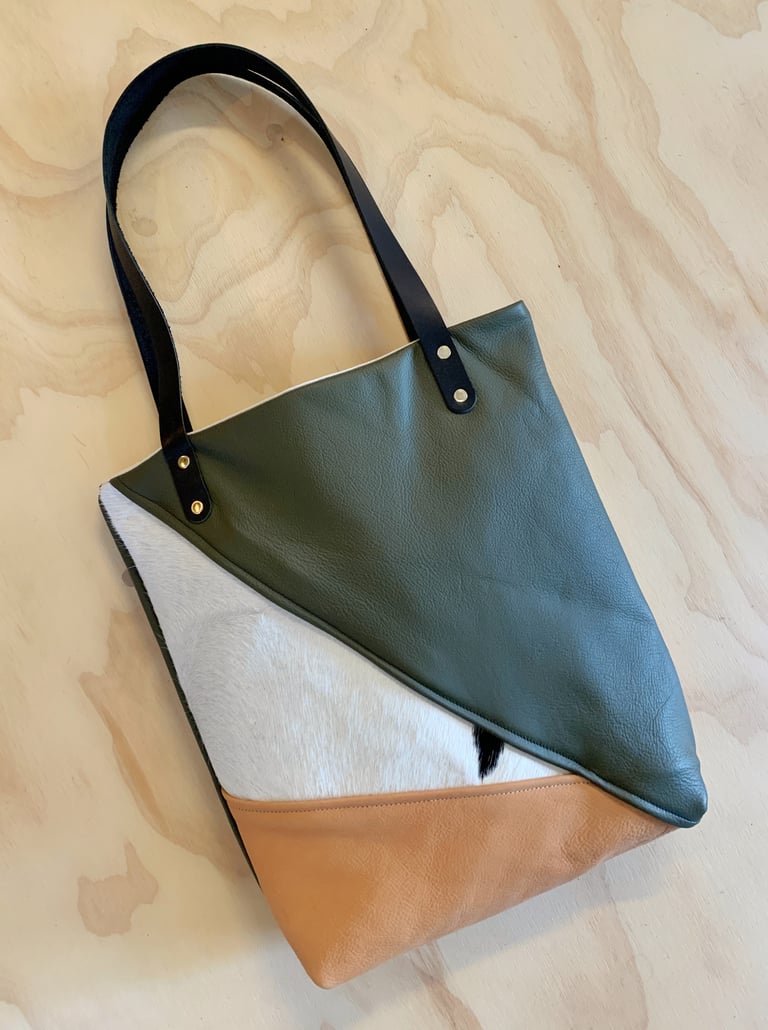 Almost a decade of bag making has left me with a rich supply of leather scraps too small to use in standard production and far too beautiful to part with or worse yet, throw away. The collage series of bags are individually hand cut and sewn; combining veg tan, garment, and hair on hide leathers. This process means each bag is truly a one of a kind celebration of color and texture.